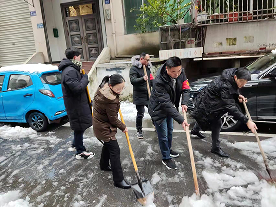 寒風(fēng)凜冽,志愿團(tuán)隊(duì)帶著鐵鍬和掃帚等工具來到駐點(diǎn)四眼井社區(qū),和社區(qū)工作人員一起鏟除社區(qū)背街小巷和包保干道的積雪和余冰。在大家的共同努力下,厚厚的積雪冰塊被清理,社區(qū)主次干道被清掃干凈,為居民的生活與安全出行帶來了便捷。