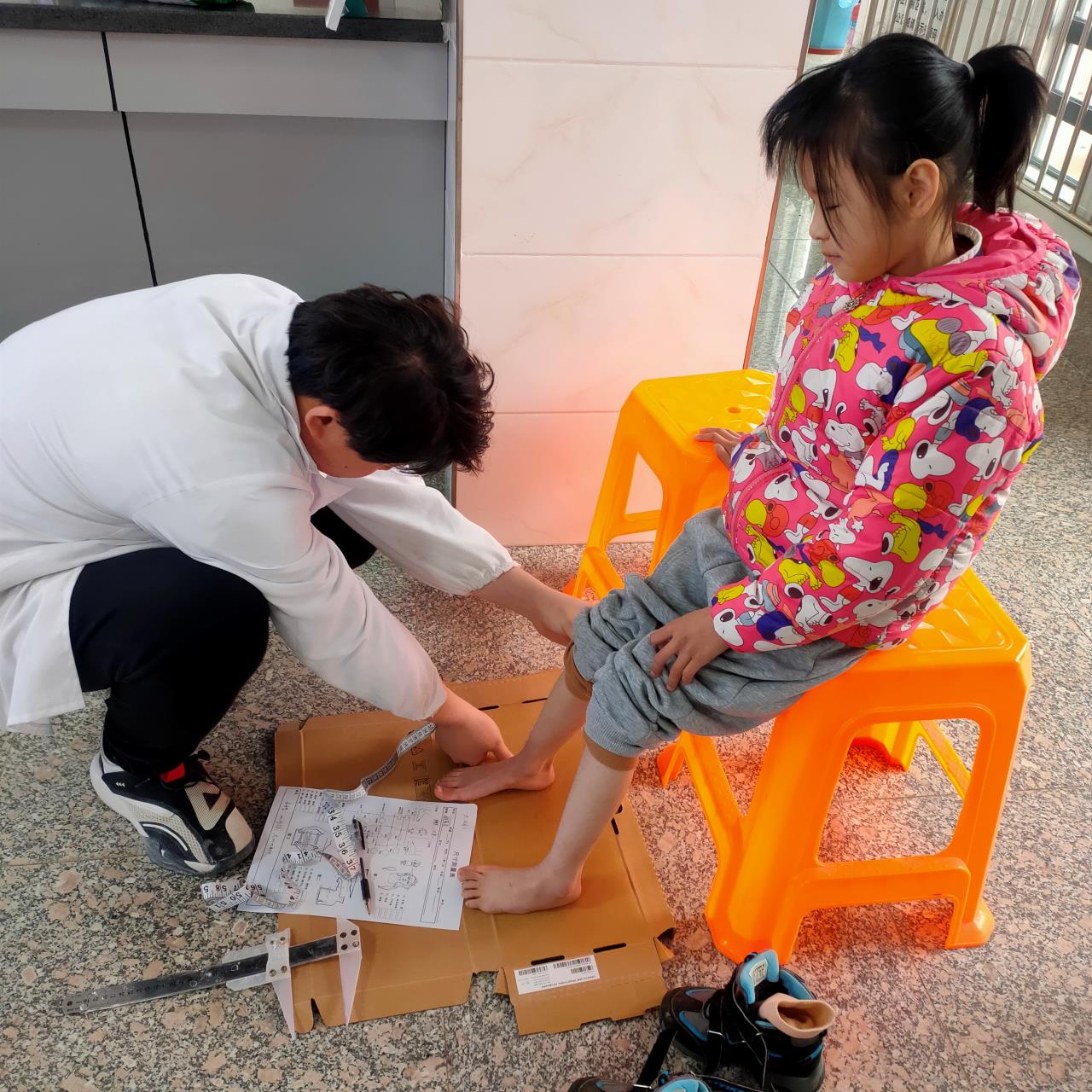 評估適配現(xiàn)場,縣殘聯(lián)工作人員為殘疾兒童家長細(xì)致講解殘疾兒童康復(fù)救助政策,讓家長充分了解殘疾兒童矯形器取模及輔助器具適配政策,進(jìn)一步提高政策知曉率及滿意度。專家組根據(jù)每個殘疾兒童的坐姿形態(tài)、行走步態(tài)等進(jìn)行功能評定,并結(jié)合其身體狀況及輔具需求制定個性化適配方案,并提供了家庭康復(fù)指導(dǎo),幫助殘疾兒童提高日常生活能力。隨后,技師人員仔細(xì)地為每個孩子測量尺寸,制作模型,為后期矯形鞋制作做好充分準(zhǔn)備工作。