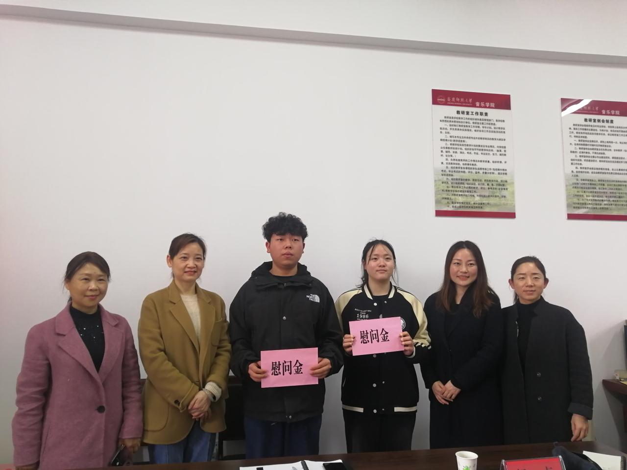 3月22日,宜秀區(qū)殘聯(lián)理事長劉曉燕一行到安慶師范大學看望慰問參加市殘聯(lián)文藝匯演兩名殘疾大學生,音樂學院高艷院長及輔導員陪同。