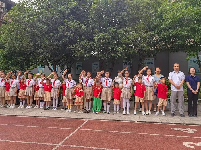 圖為公園小學(xué)的少先隊(duì)代表為康復(fù)中心兒童戴上紅領(lǐng)巾,共同向隊(duì)旗敬禮
