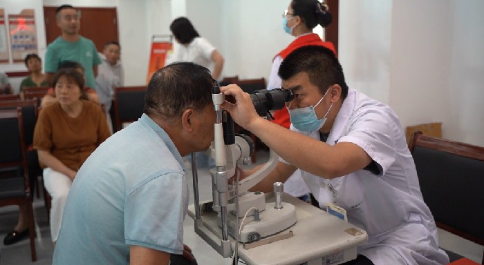圖為眼科醫(yī)生為群眾免費(fèi)檢查眼睛
