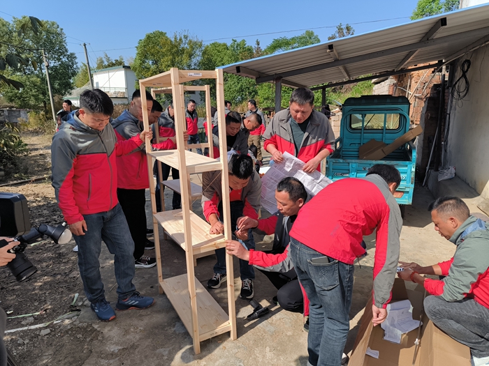 圖為志愿者為汪久繼搭建直播間設(shè)施現(xiàn)場