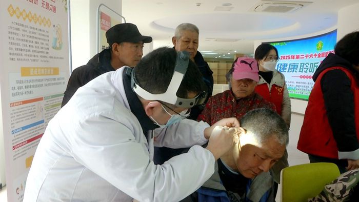 圖為醫(yī)務(wù)人員為居民檢查聽力健康狀況