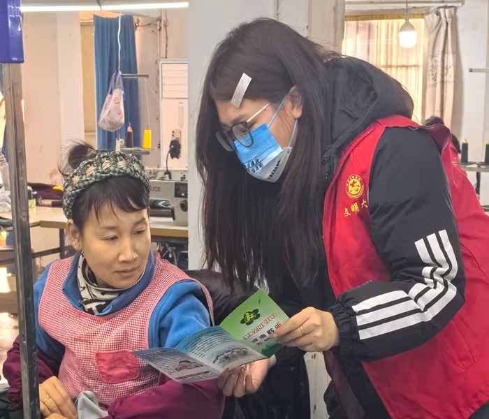 圖為大觀區(qū)??阪?zhèn)殘聯(lián)工作人員走進(jìn)制衣廠車間宣傳護(hù)耳知識(shí)