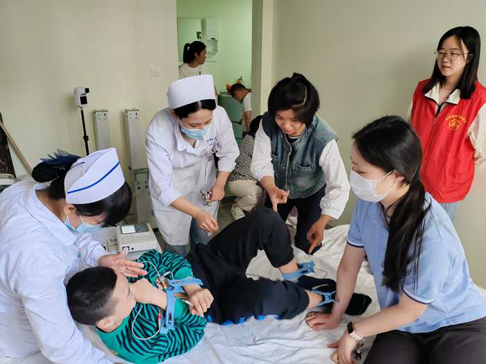 圖為醫(yī)護(hù)人員為殘疾兒童做心電圖檢查