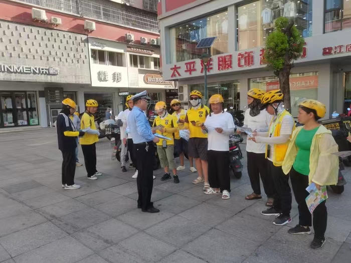 圖為交警走進(jìn)外賣小哥中間宣講交通安全知識(shí)