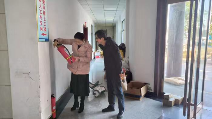 圖為市殘聯(lián)理事長(zhǎng)余月紅查看消防器材