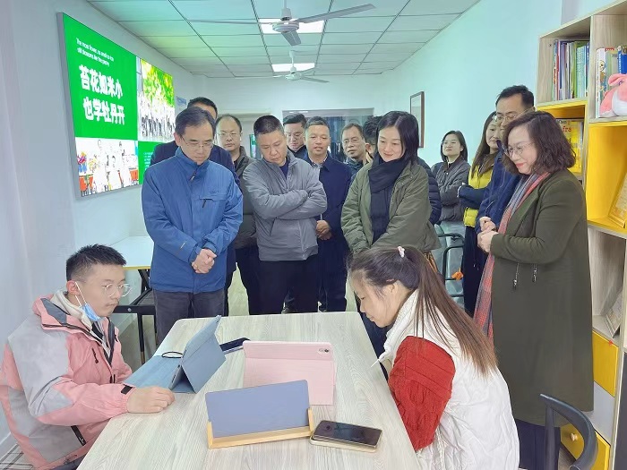 在沐陽(yáng)之家創(chuàng)始人、民進(jìn)會(huì)員潘金云的介紹下,南通民進(jìn)經(jīng)聯(lián)會(huì)一行首先實(shí)地參訪了沐陽(yáng)之家的5G智慧工廠,詳細(xì)了解社會(huì)企業(yè)的創(chuàng)辦歷程、當(dāng)前運(yùn)營(yíng)狀況以及長(zhǎng)遠(yuǎn)發(fā)展規(guī)劃。隨后,南通民進(jìn)經(jīng)聯(lián)會(huì)一行走進(jìn)沐陽(yáng)之家殘疾兒童康復(fù)中心,依次參觀黨建文化長(zhǎng)廊、功能康復(fù)教學(xué)區(qū)、殘障青年就業(yè)成果展,并與中心青年學(xué)員親切交流。學(xué)員們展現(xiàn)出的開朗樂(lè)觀、自強(qiáng)不息的精神面貌,讓在場(chǎng)人員深受觸動(dòng),大家紛紛為中心的康復(fù)教育和就業(yè)培訓(xùn)成果給予充分肯定和贊揚(yáng)。